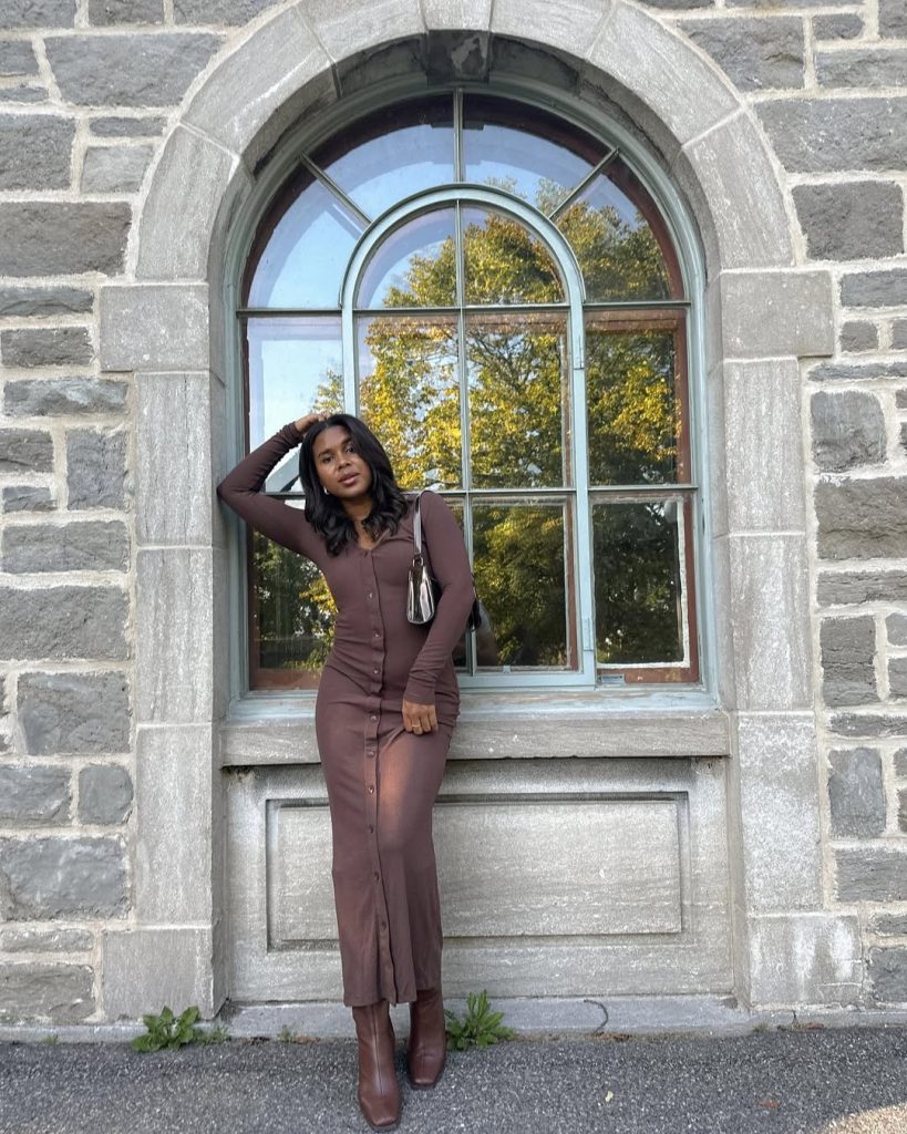 This is the dress you throw on when you’re “not sure what to wear” but still want compliments at dinner. Play with the buttons to create a subtle front slit, then add a camel coat for colder nights. A berry lip looks beautiful with chocolate tones and on Black women in particular, but any warm neutral makeup will work. I’d skip bulky scarves that hide the neckline; a slim scarf or fine chain necklace keeps everything streamlined. Perfect for date night, a gallery opening, or a cozy evening drink at a hotel bar.