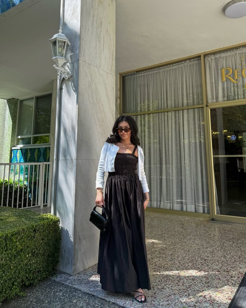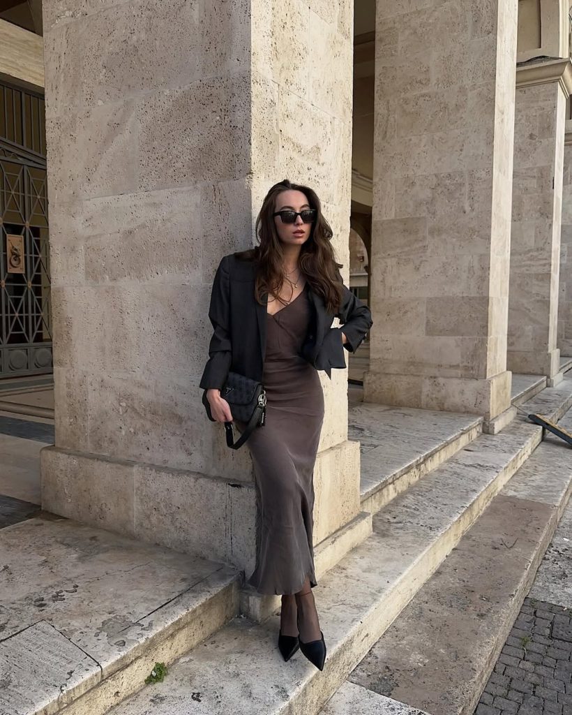 When your calendar says “client meeting then cocktails,” this is the kind of outfit that answers both calls. During the day, keep the blazer buttoned and add a structured tote. For evening, slip the blazer off the shoulders and let the dress carry the drama. A sleek low ponytail or soft waves keeps the look intentional. I’d avoid chunky sneakers with this one; they’d fight against the refined lines. Instead, consider swapping to strappy sandals if you’re leaning more toward “dinner in Rome” than “desk at 3 p.m.”