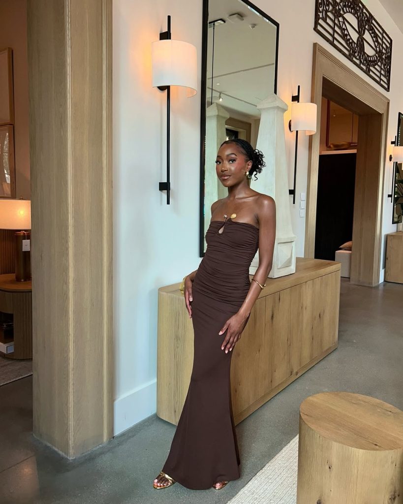 A ruched strapless chocolate column maxi defines the waist and creates a statuesque line, ideal for weddings, milestone birthdays, or any 2026 event that calls for drama.