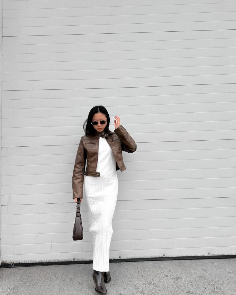 A ribbed white knit maxi paired with a cropped brown leather jacket is all the 2026 fashion you need for the season.