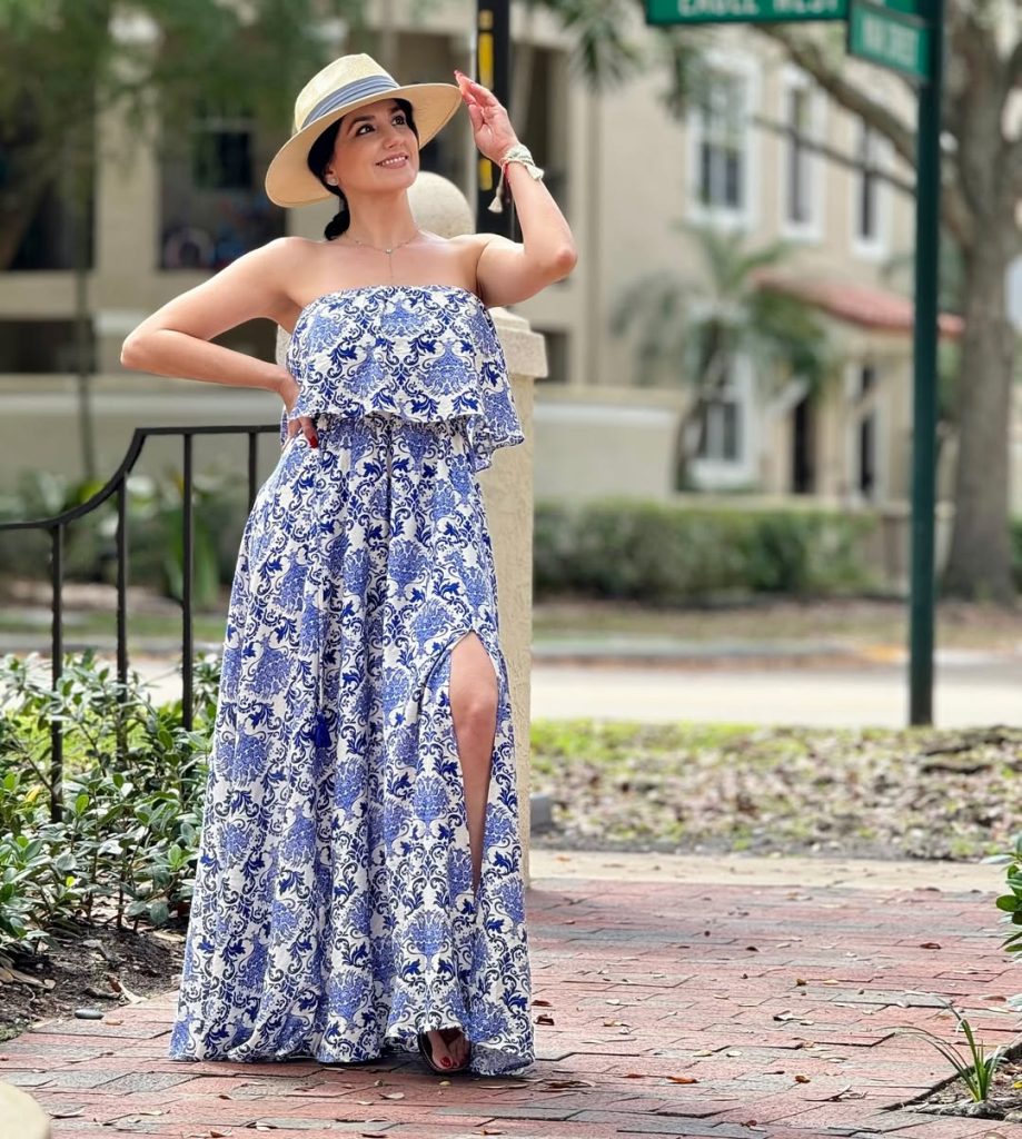 A strapless blue-and-white floral-inspired maxi with a flounced bodice and side slit feels like a postcard from a Mediterranean summer, complete with a wide-brim hat.