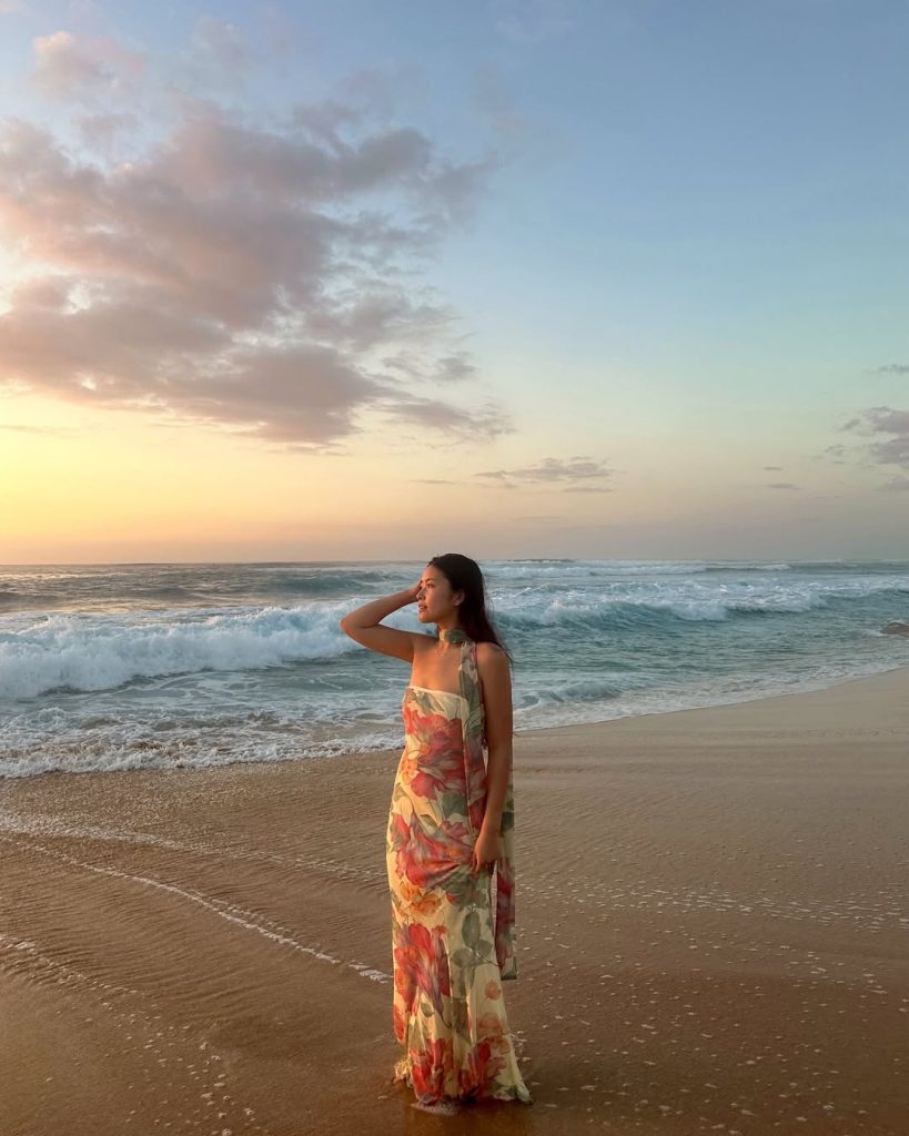 A fluid, painterly floral maxi drifts along the shoreline, the soft print catching the last blush of summer light in the most romantic way.