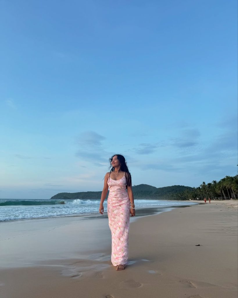 A blush pink slip-style maxi traces the figure gently, turning a simple seaside walk into a quiet little fashion moment.