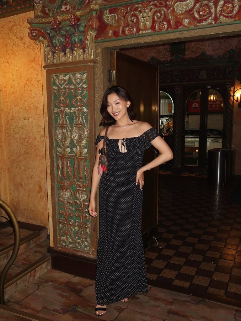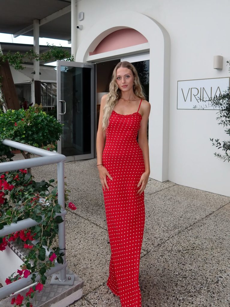 A slim, dotted red maxi hugs the body just enough, giving classic movie-star energy that feels right at home on warm summer evenings.