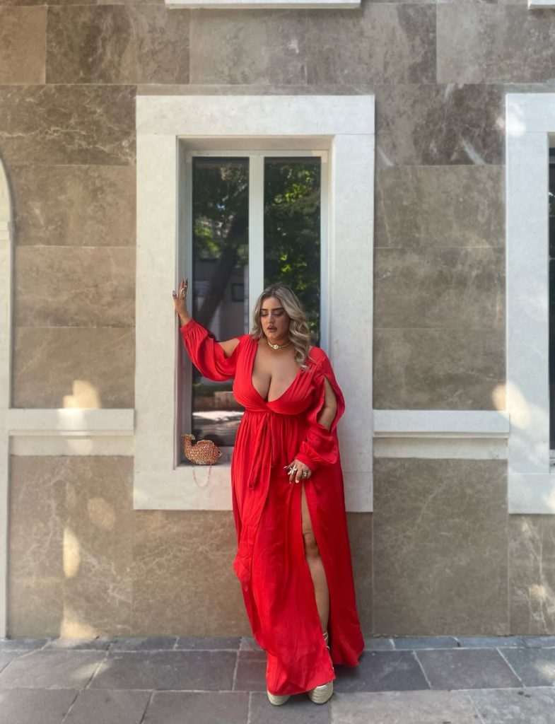 Voluminous fabric, bold red color, and daring cut-outs turn this maxi into a statement piece that’s impossible to ignore.