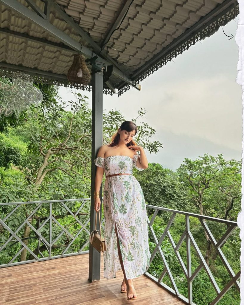 Soft botanical prints and an off-shoulder cut make this airy floral maxi a natural choice for weekend getaways and balcony breakfasts.