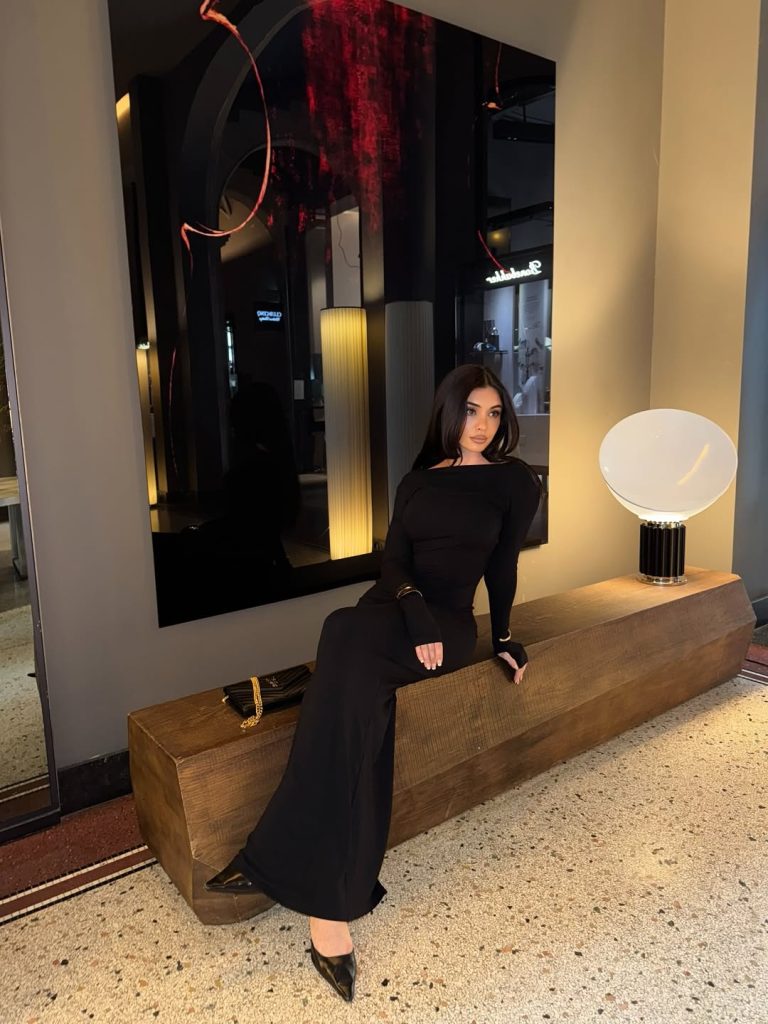 An ultra-sleek black column dress with a fitted long-sleeve design reads like modern armor—minimal, sharp, and undeniably chic.