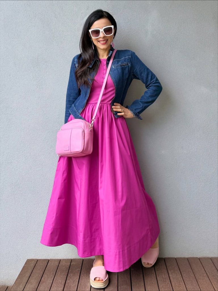 A bold pink maxi paired with a fitted denim jacket offers playful street fashion that doesn’t skimp on adulthood.