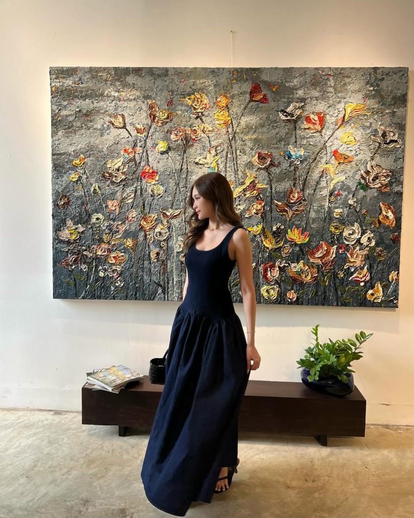 A simple black tank maxi body by an art installation background allows for the ideal mix of black fashion simplicity to provide the very best aesthetic effect.