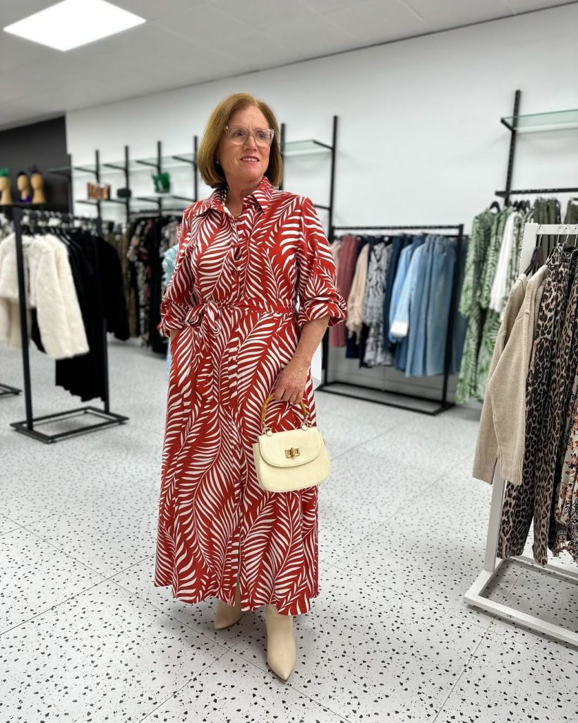A striking red shirt maxi in a leaf pattern is simply perfect for wiping the slate clean in terms of fashion for 2026 fashion enthusiasts.