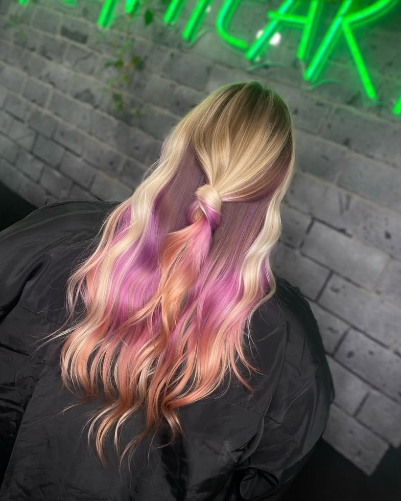 This look pairs a creamy blonde surface with a painterly underlayer that shifts from orchid purple to melon-soft pink and apricot. The color lives beneath, so with hair down it peeks through the S-waves; pull a half-knot and the spectrum fully blooms. Ask your colorist for a curved under-panel that follows your head shape—think of it like a printed placement diagram wrapped around the occipital bone.