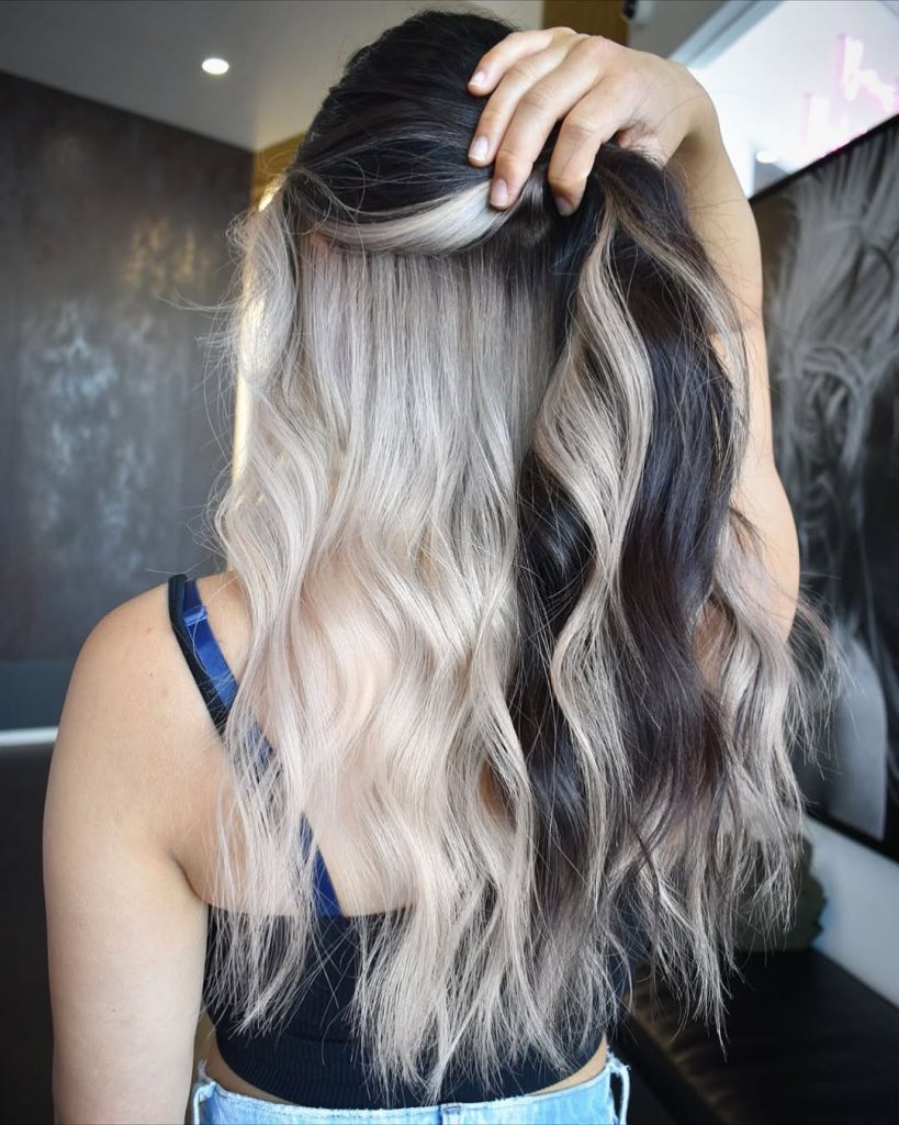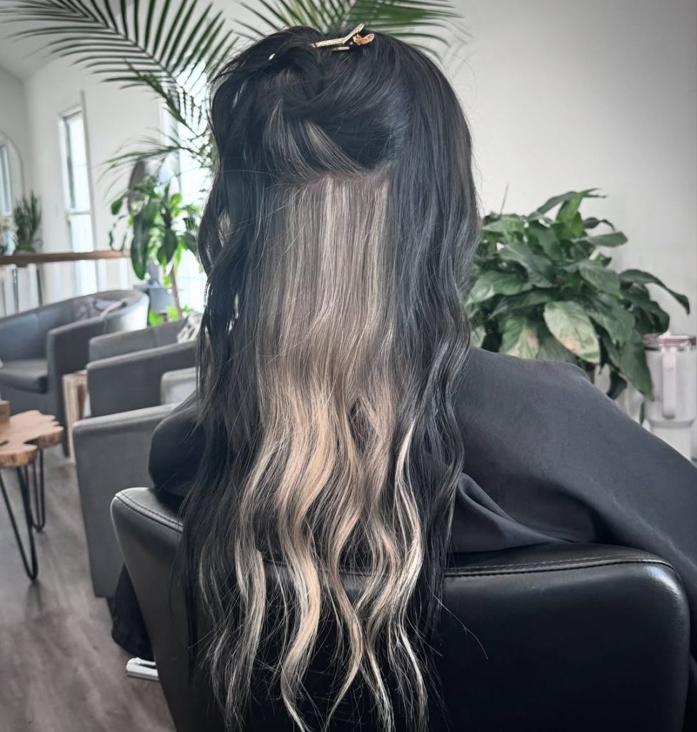 An elegant study in contrast: cool silver underlayers flow beneath inky espresso lengths. With hair flipped, shafts of light platinum flash from within—sleek, architectural, and very editor-in-chief.