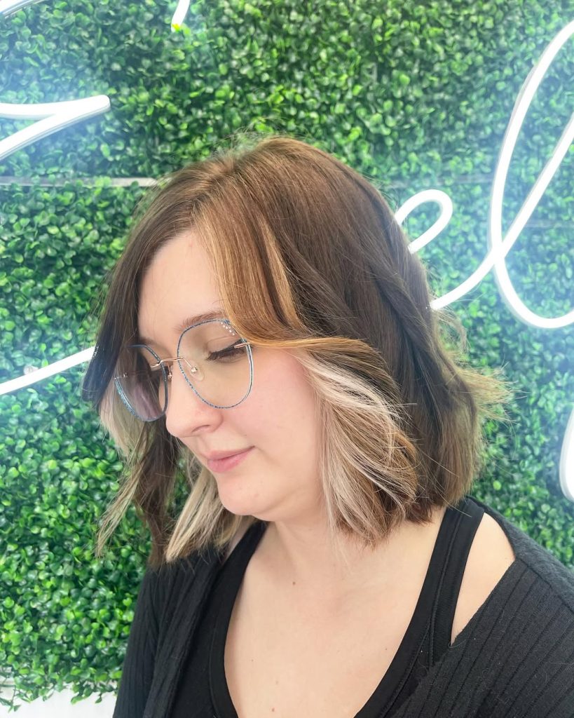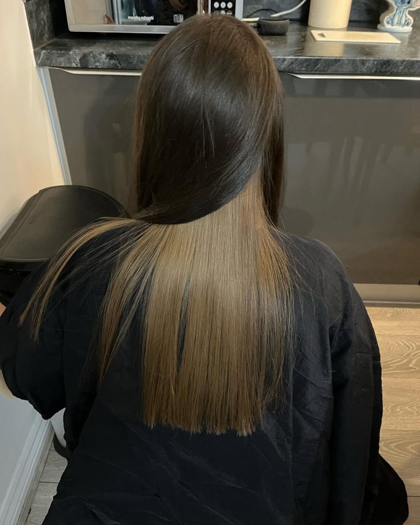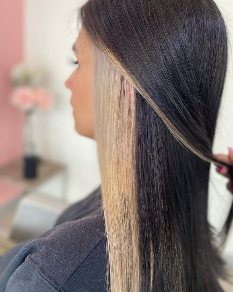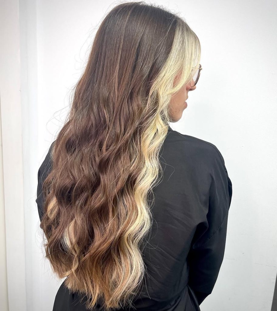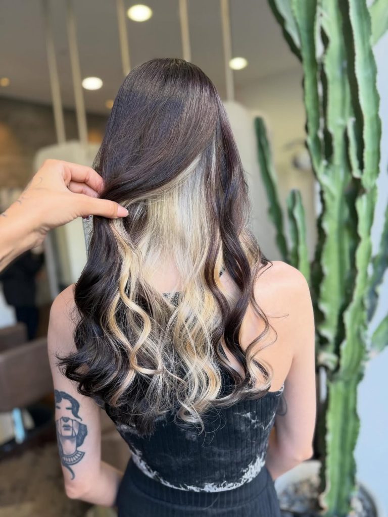 Why it flatters: The neutral blonde cools warmth in the skin, while the espresso veil keeps dimension. Ask for a slim rectangular under-panel starting just behind the ear—easy maintenance, easy grow-out.