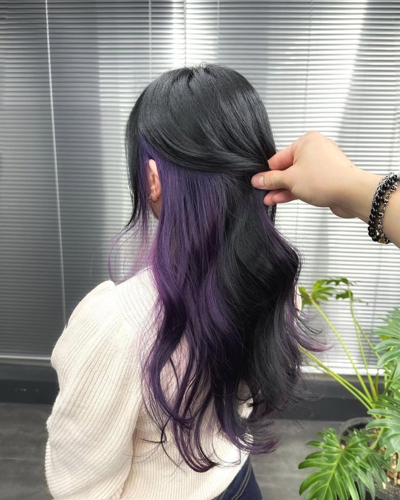 Midnight-black settles over a royal-to-amethyst purple underlayer. The color pops when hair is half-pinned or tossed forward—equal parts chic and playful.