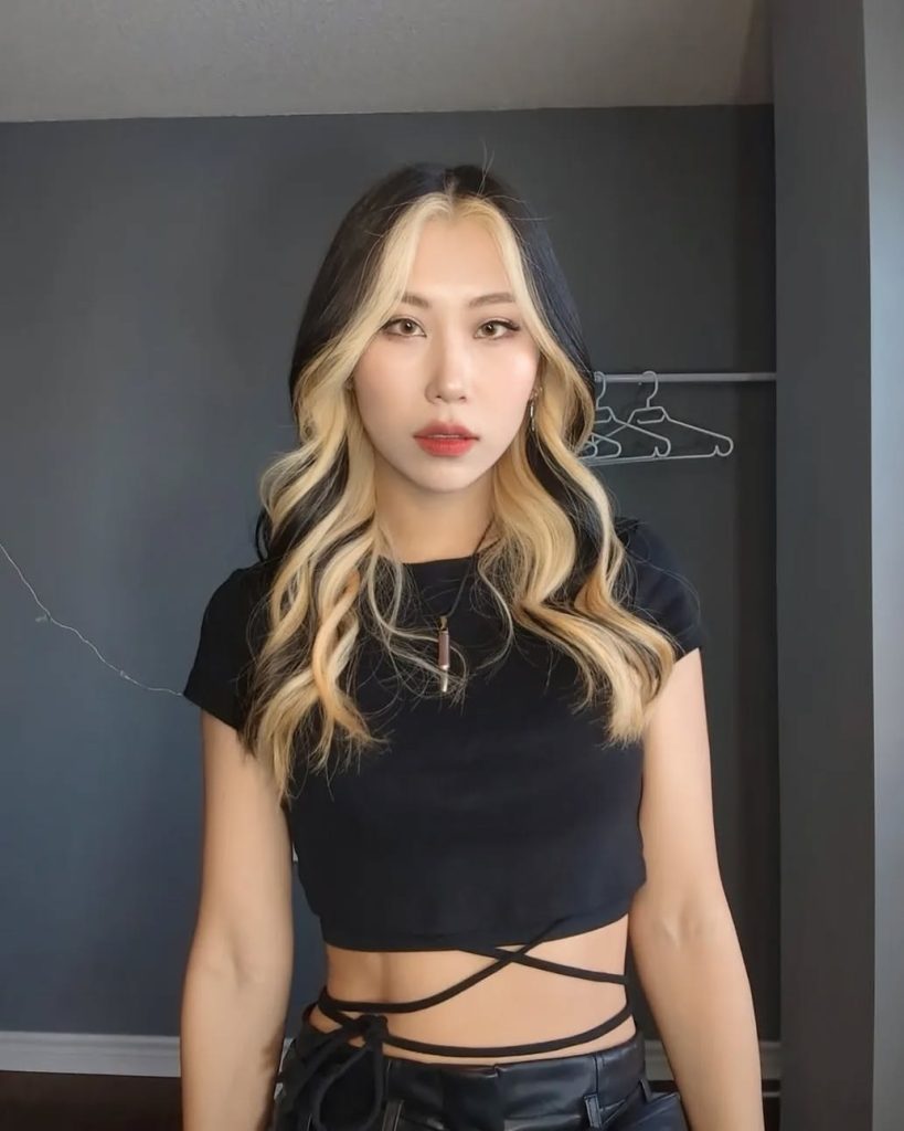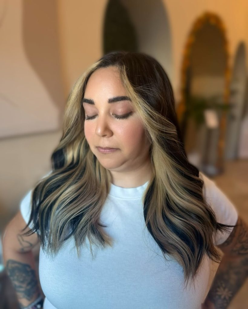 The cream-colored front rests above your face, with everything else shaded dark for high contrast and immediate lift. This one’s basically just for kicks compared to other e-girl styles—it’s cleaner, softer, and can be styled in any width. Also, because you can control which part is how much on top, this is a blonde on top with dark skin. Ask for ribbons with roots that are softly attached so it feels posh.