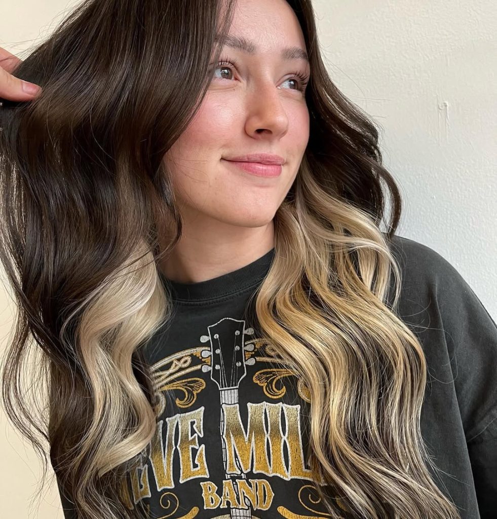 Chocolate layers are veiled over wide, sandy panels that brighten the money pieces and peek through the mid-lengths. It’s that effortless rocker-romance balance: dimensional brunette depth with ribbons of blonde that read luxe, not flashy. I love this technique for women who want a glow near the complexion without a full overhaul—think “weekend spotlight, weekday chic.” Ask your colorist for curved front slices plus sporadic interior foils; a sketched placement diagram keeps the reveal predictable when you flip or tuck.