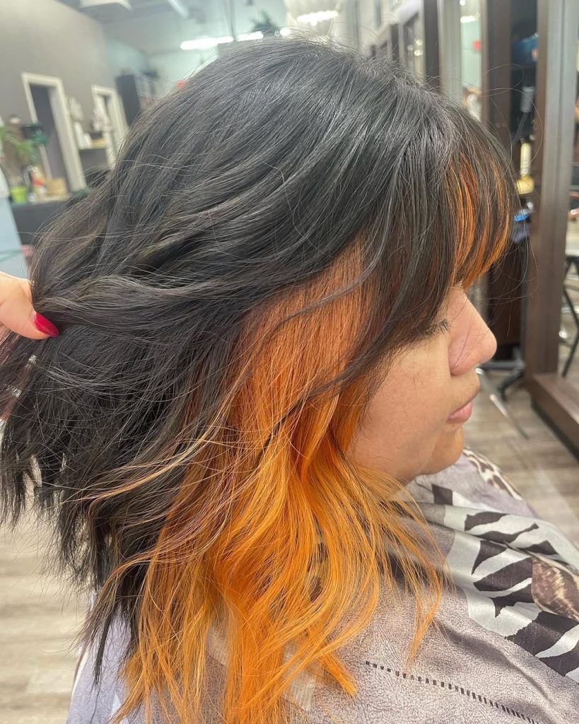 Midnight espresso holds a fiery underwash that moves from copper to marigold—call it “spiced cider.” The warmth flashes through shaggy layers and a soft fringe, giving major fall energy without sacrificing depth. I did a similar palette for a client who swears her wardrobe looked newer overnight; warm satin blouses suddenly sang.