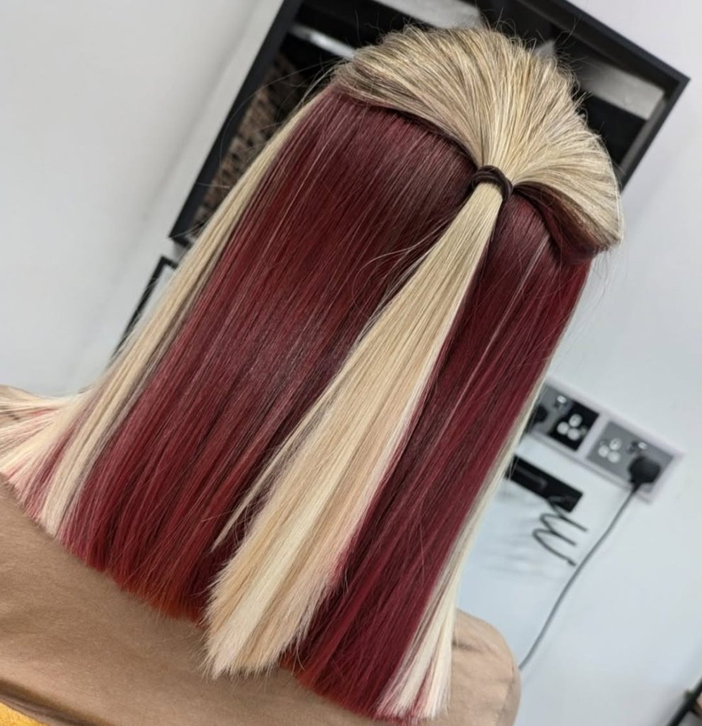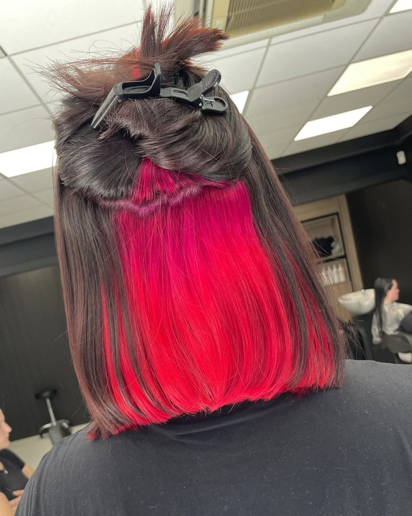 “It’s peek-a-boo on serious steroids: graphic cherry A red panel hides beneath a blunt, shoulder-grazing bob. With hair down it’s mysterious; clip the crown, and the neon underlayer turns the cut into modern art. The contrast sharpens jawlines and makes black wardrobes look intentional.