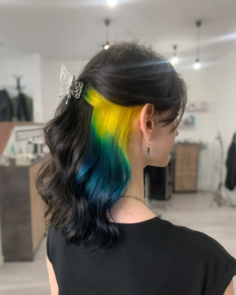 Color strategy: Pre-lighten the under-panel evenly, then paint a vertical ombré—yellow at the top for luminosity, green bridging into blue at the ends. Ask your colorist to sketch the sectioning so the reveal lands exactly at cheekbone level.