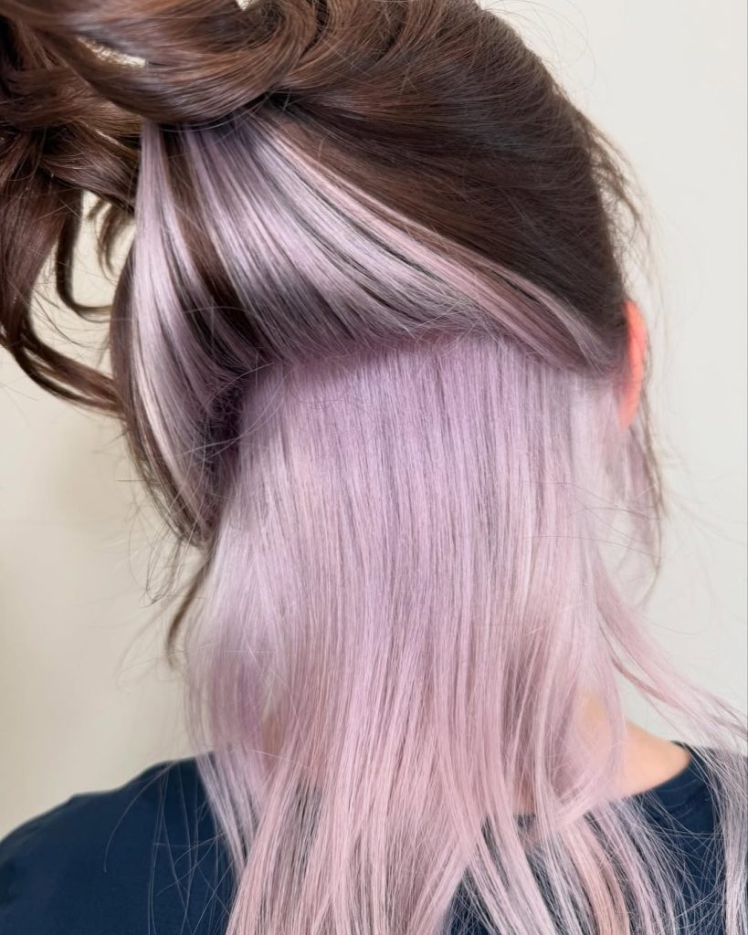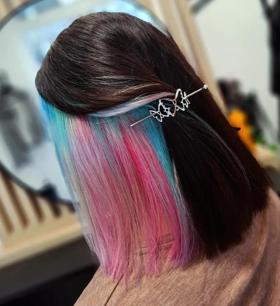 A glossy brunette veil opens to a watercolor panel—sky blue kissing bubble pink with a whisper of lavender. The section is wide and flat, so the shades read clean and graphic when clipped half-up with a barrette. It’s playful without losing polish, the kind of peek that brightens a gray tee and jeans on school drop-off and still turns heads at a Saturday brunch.