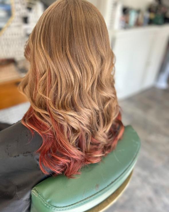 Soft caramel waves finish with a hidden chile-pepper hem: the lower three inches glow Red when the hair swings or when you flip the ends out with a curling iron. It’s a subtle heat that flatters golden skin and adds dimension to every bend—think sunset at the beach, bottled.