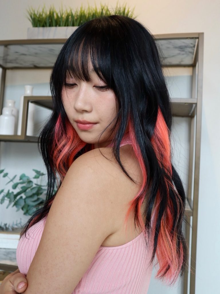 Raven lengths cascade over coral ribbons that illuminate the cheekbones. The peak is concentrated around the face, so it acts like blush for the hair—fresh, youthful, and incredibly flattering. A soft fringe makes the color peek through with every blink.
