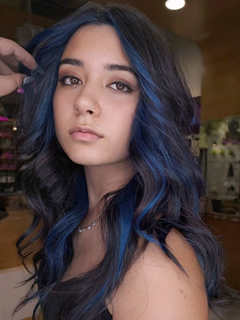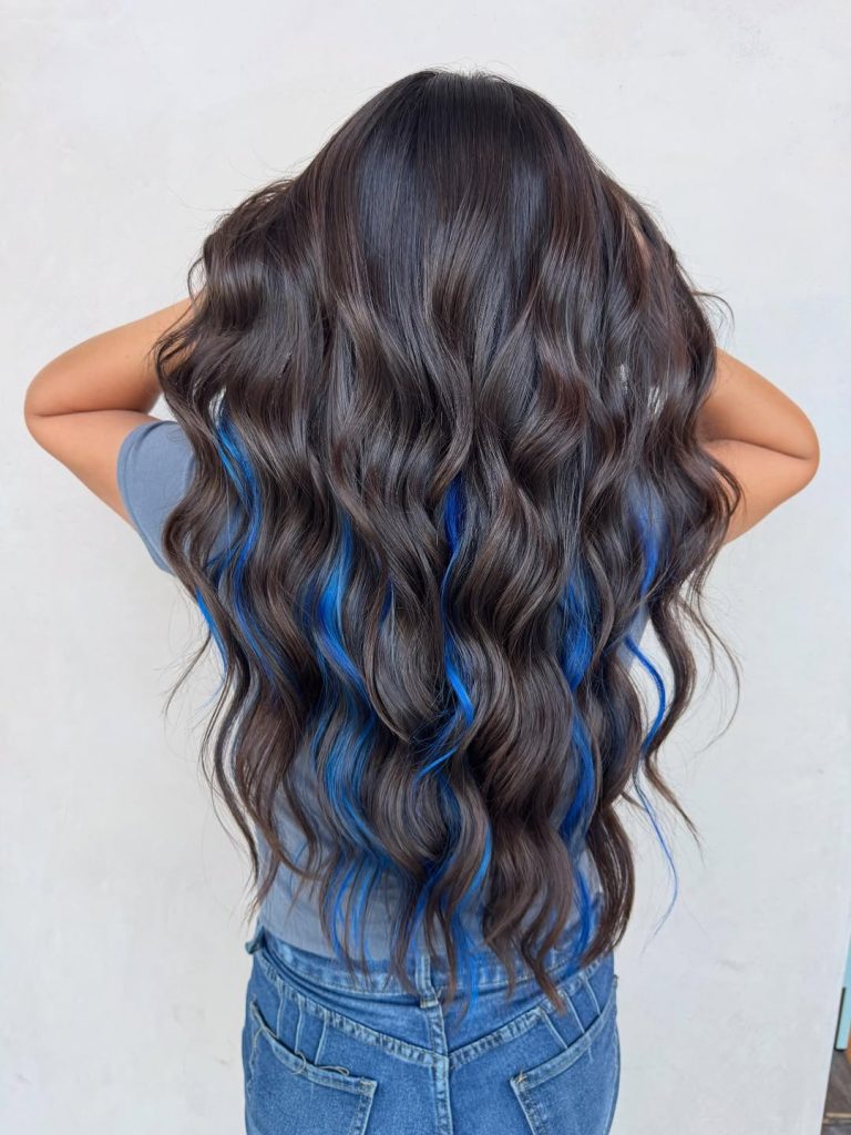 Cocoa lengths carry slim, saturated ribbons of blue that hide between the bends and flare when the hair moves. The placement is clever—narrow slices dropped beneath the top veil—so you get punctuation marks of color rather than a block. On long, brushed-out curly waves the effect is cinematic, and it’s gorgeous on brunettes who want impact without bleaching the whole head. Ask for staggered interior foils; this map is one of my favorite placement ideas for busy weeks when grow-out needs to be simple.