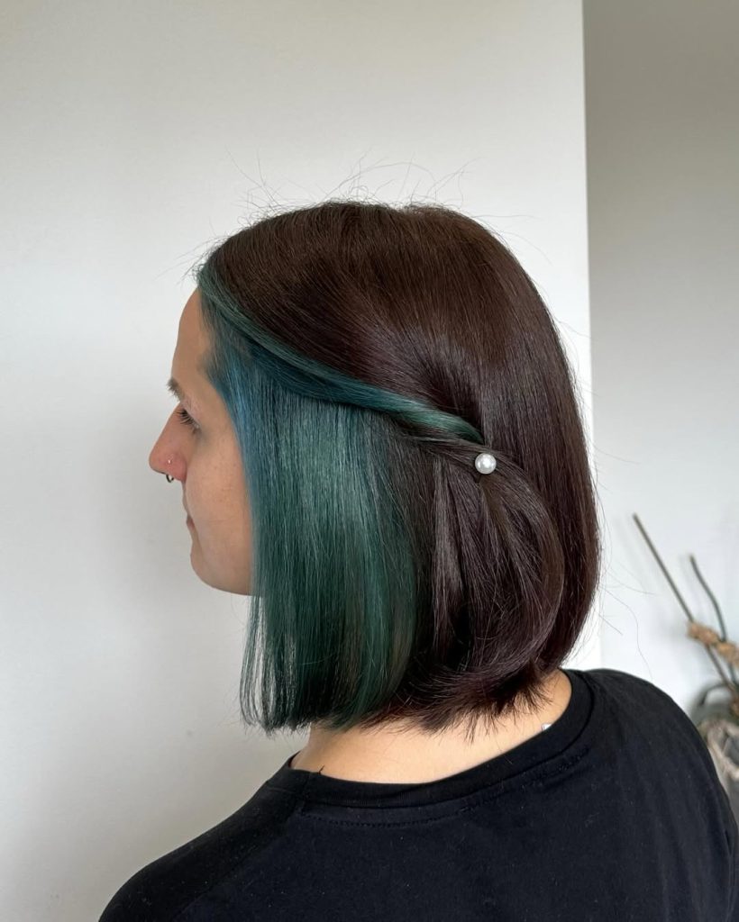 A neat, chin-skimming bob conceals a marine green panel that shines when you twist and pin the side. The silhouette stays classic while the color keeps it fun—work by day, indie concert by night.