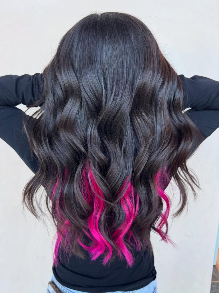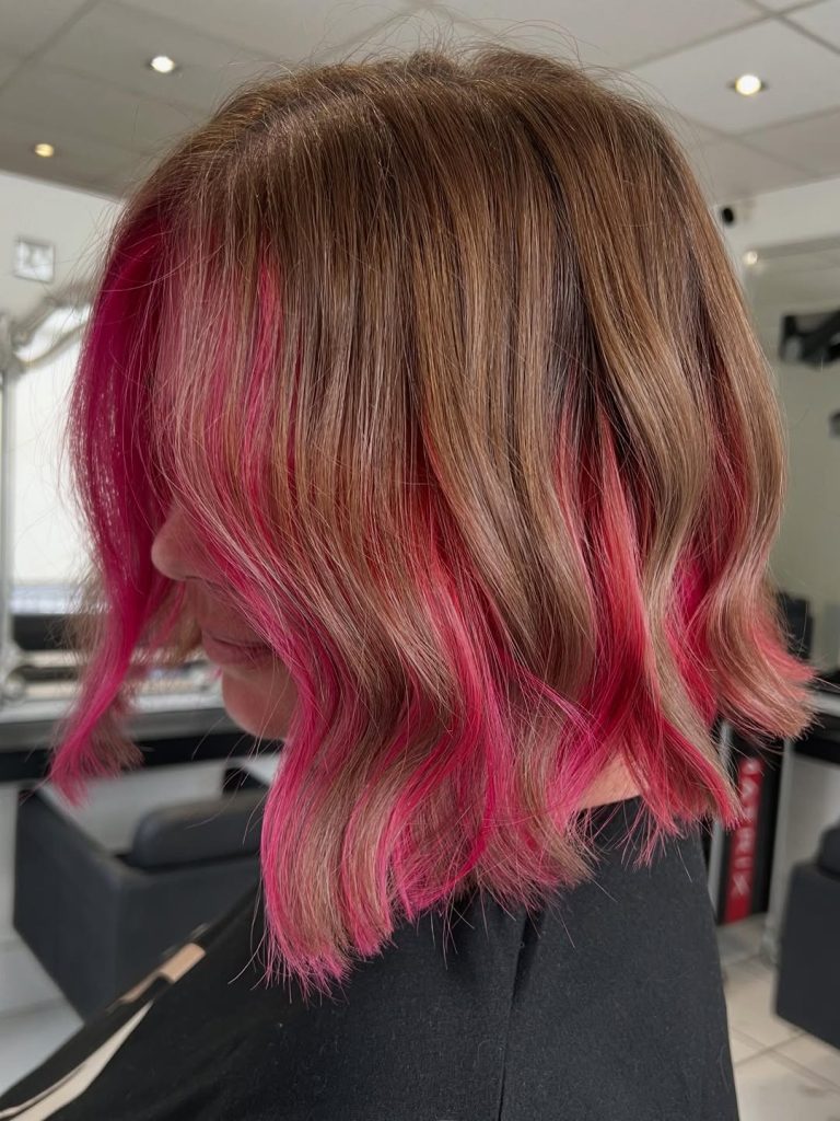 Jet lengths open to a neon-magenta under-hem that reads like lipstick for your hair. Keep the veil deep and glossy so the pink pops out in the mids and ends—it’s all about weekend vibes, and then it’s Monday meeting ready. Only curl the lower part to encourage the peak to appear. If you’re trying it out for the first time, it’s a great precursor for full-on vivids.