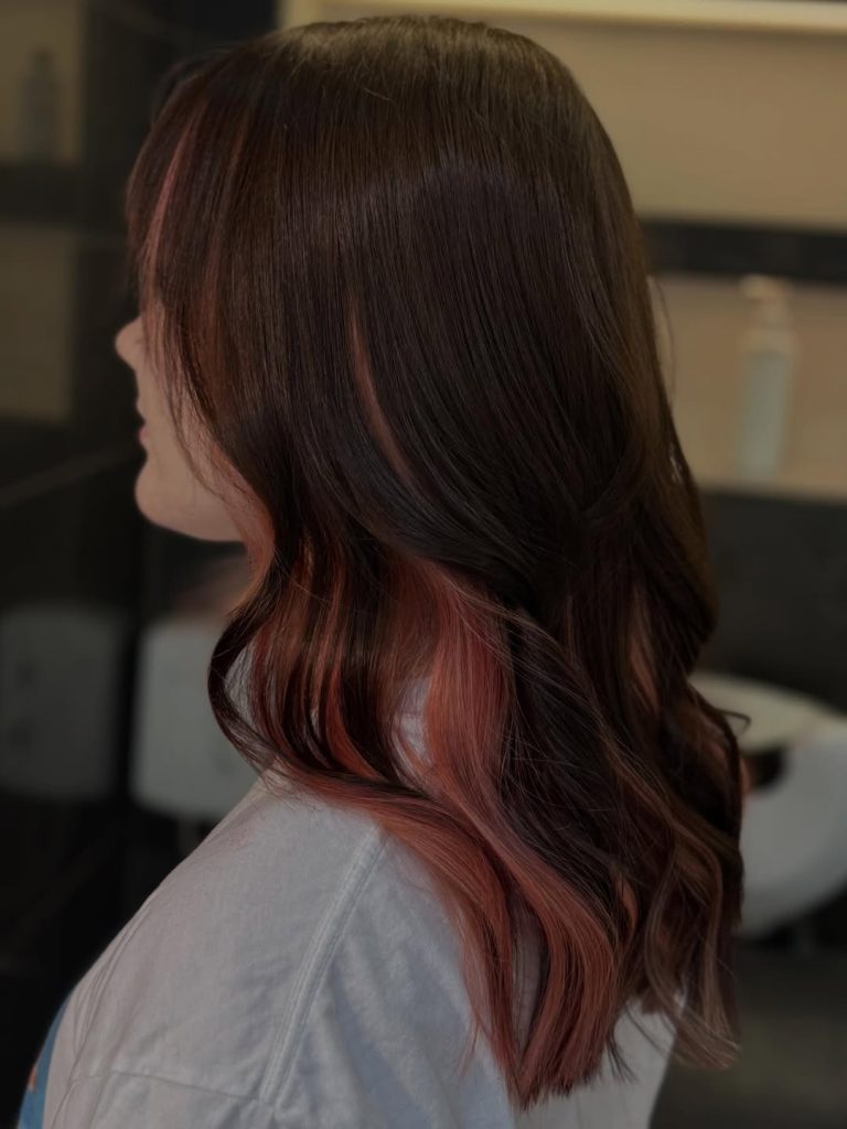 A soft, shoulder-skimming cut hides rosy panels behind a warm brown veil. The face-framing slices act like blush, while the inner pink brightens the perimeter when you bend the ends. Because the cut is short-to-midi, the peek feels playful but is still wearable with a blazer. Have your colorist sketch a quick placement diagram: two front slices + a halo panel from ear to ear.