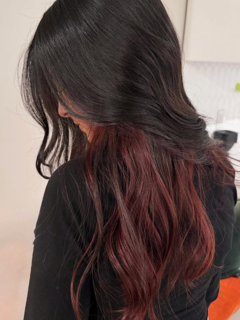 Deep merlot is actually woven under the glossy blacks but comes out towards the mids and ends, like stained glass. On relaxed curly waves, it looks like it’s moving—or melting—which is so sophisticated. Also, keep your tones cool to prevent them from turning copper if you have hard water.