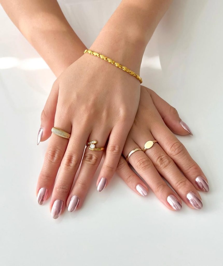Warm and sun-soaked pink chrome that subtly graduates from pastel to bright depending on the angle. For a more stripped-down look, try almond shapes. The surface has a mirror-like quality that appears liquid-like.