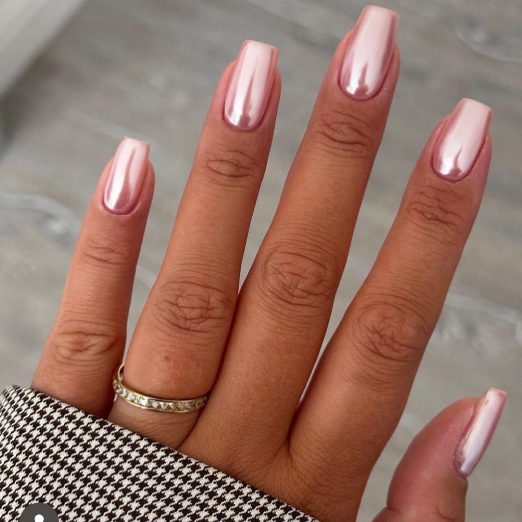 Short, boxy squares in baby-pink chrome—clean, minimalist, and wearable. The length is practical, the shine is polished, and the undertone flatters both cool and warm skin.