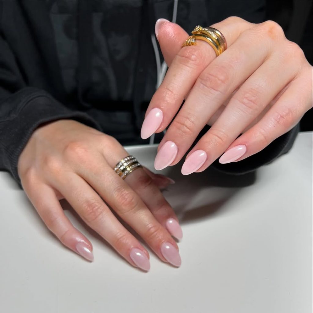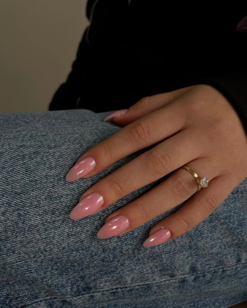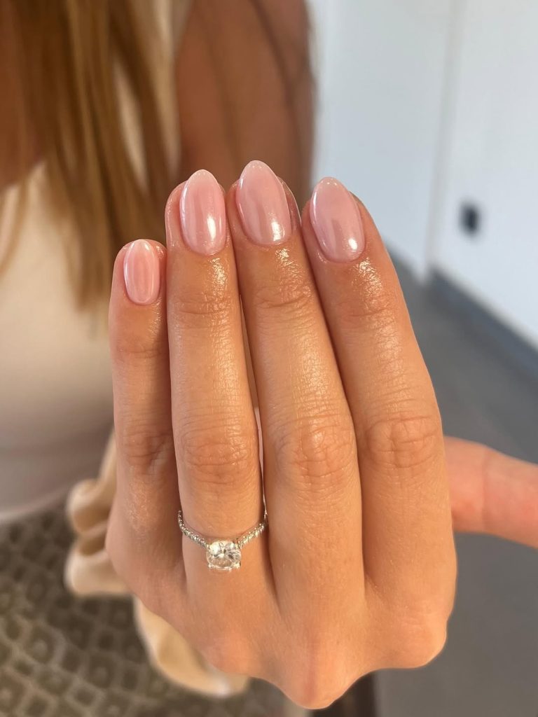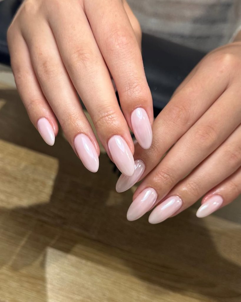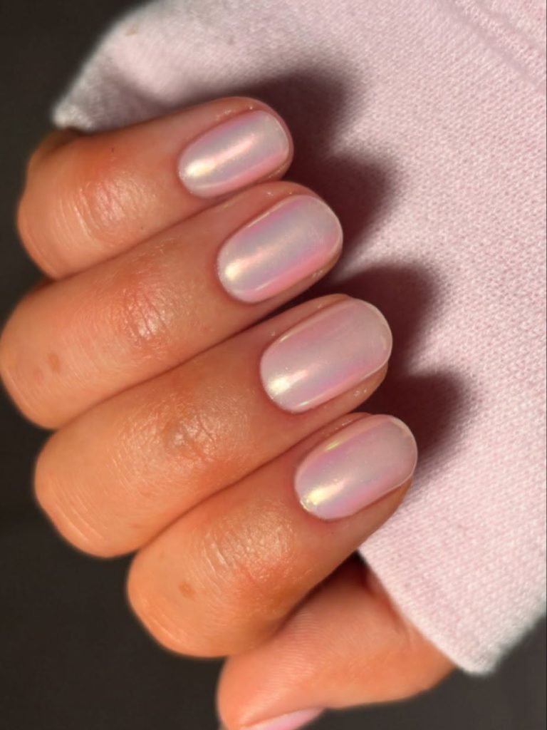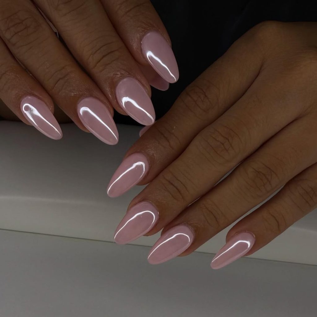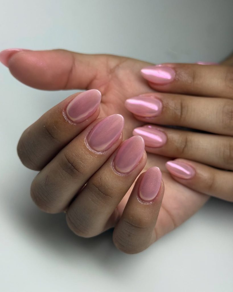 Think rose quartz, but make it chrome: a translucent milky pink with a glossy, reflective overlay. The short-to-medium oval reads natural and low-maintenance, perfect if your schedule is packed but you still want that “I tried” polish.