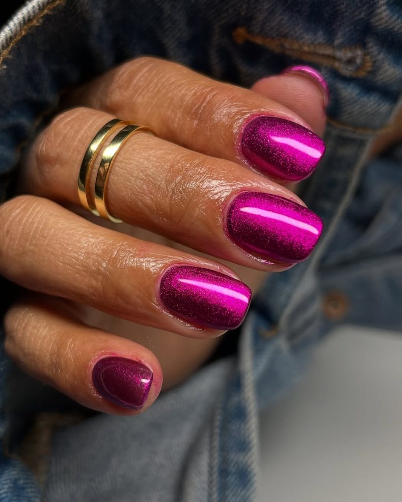 Here’s your statement: hot, almost neon fuchsia chrome paint job framed in short, squared-off nuggets. The particles create dimension when shone for a pop of color rather than chunkiness. The shorter length just lets the color speak for itself.