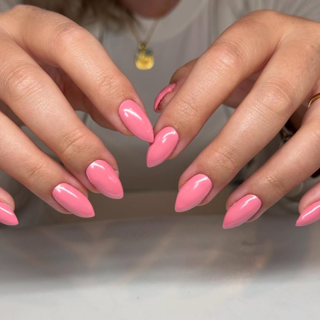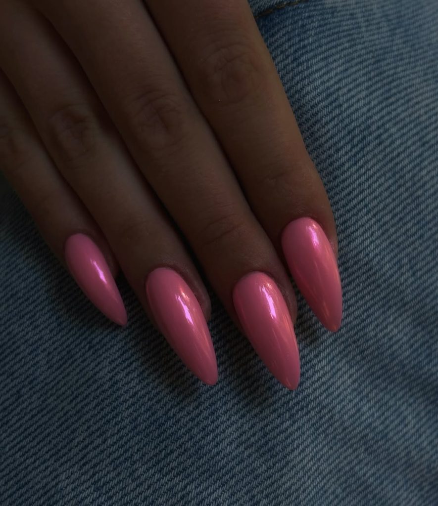 Long almond nails in luminous bubblegum chrome that reads vivid in low light and candy-bright in daylight. The elongated tips create drama without tipping into costume.