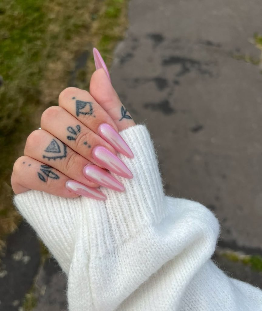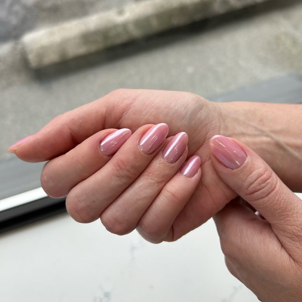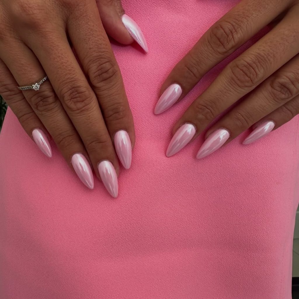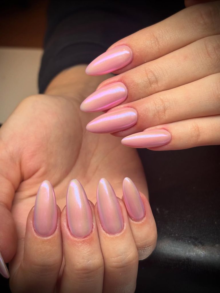 Baby pink with a pearlescent chrome veil on softly tapered almond nails—romantic, quietly luxe, and wonderfully soft. The sheen looks like a satin pointe shoe under studio lights.