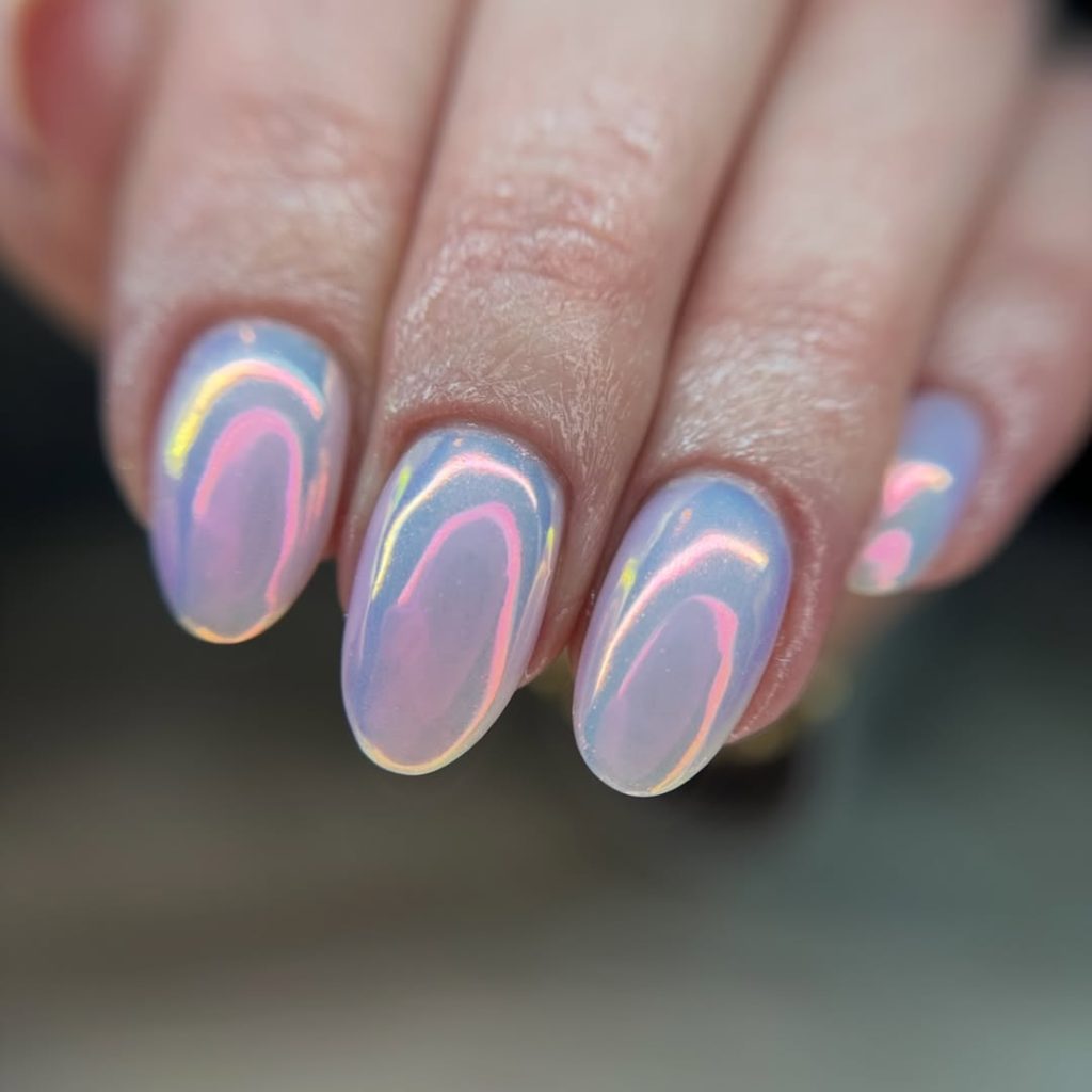An ethereal, opalescent pink shifts to lemon and lilac as the light moves, kissed with a soft chrome mirror. The medium almond length keeps it wearable, while the rainbow gleam makes it party-ready without extra art. It’s that whisper of glam you notice when you lift a latte cup.