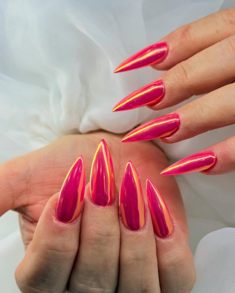 A high-voltage pink chrome with an orange-gold undertone, sculpted into razor-sharp stilettos. The reflective ridge down the center gives a lacquered, runway finish—bold, playful, unapologetically Barbie-coded, and perfectly on trend for 2026.