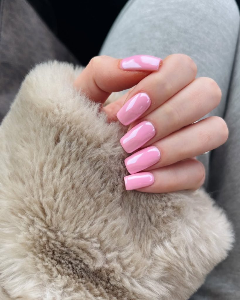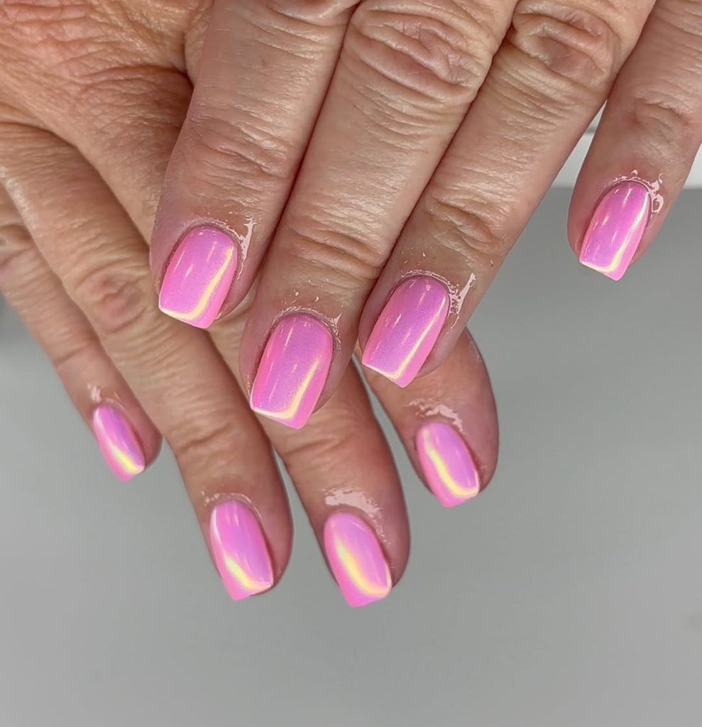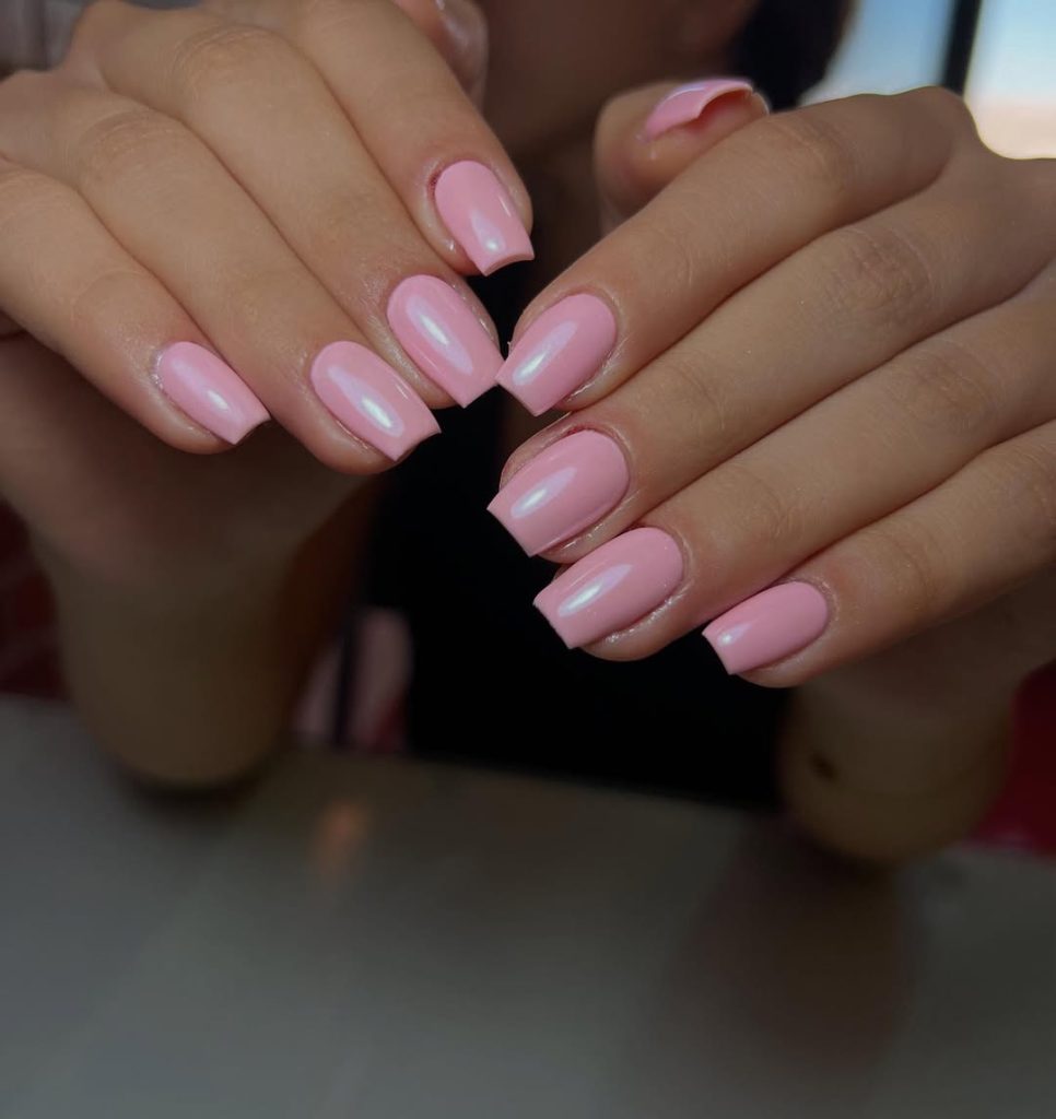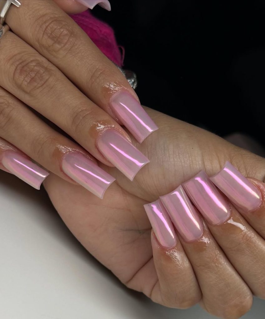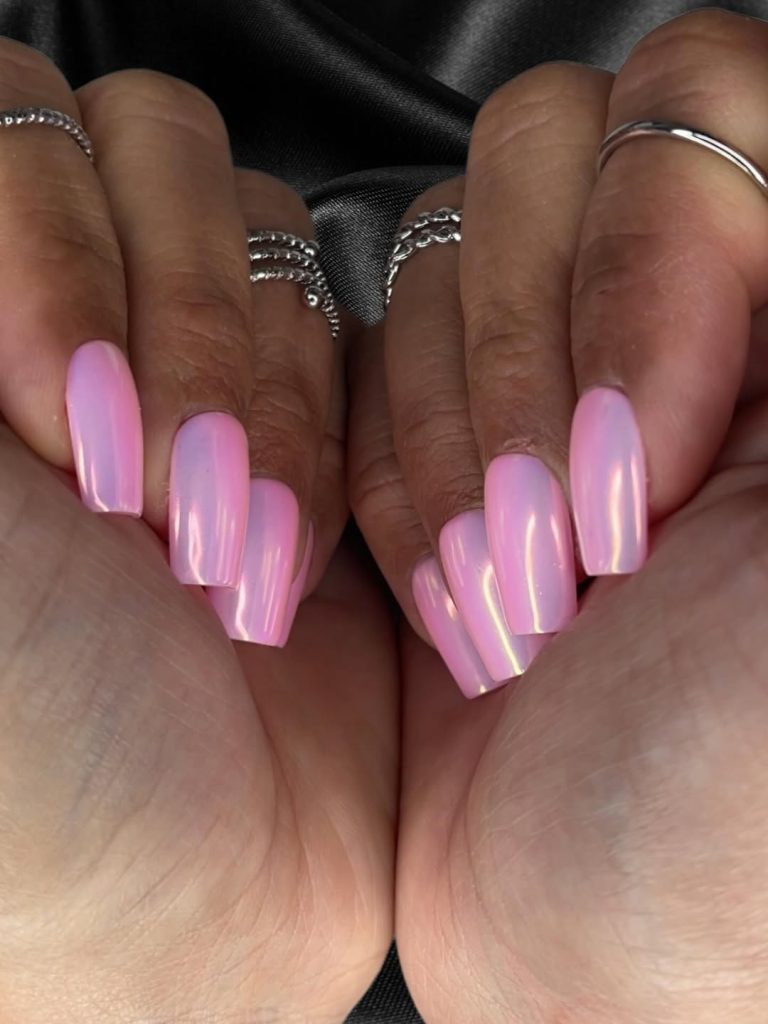 Short, rounded squares shimmering with opalescent pink—airy, practical, and pretty. The glow shifts under different lighting, so it feels elevated without extra art.