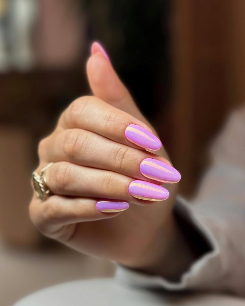 A pink-meets-lavender base with warm, reflective arcs—like sunset bands caught on chrome. The medium almond length reads sleek and modern, and the shimmer carries just enough sparkle for dinner plans.