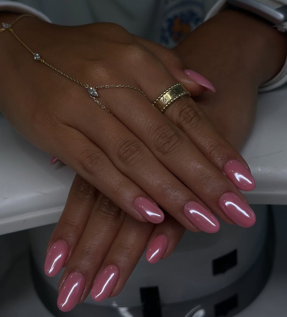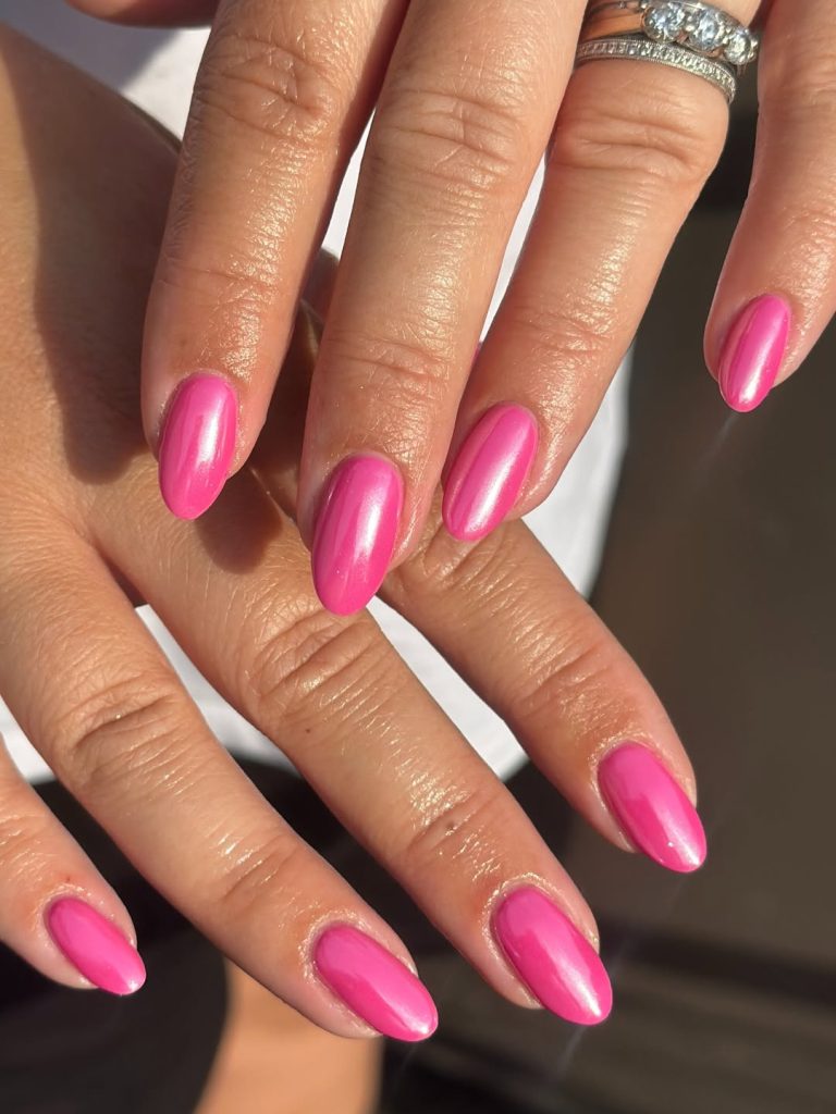 A rosy pink chrome with a clean, mirrored ridge on medium almond nails. The color sits between bright and soft, so it reads polished at work and flirty after hours. Gold jewelry warms the tone; silver makes the sheen look icier.