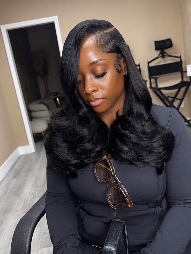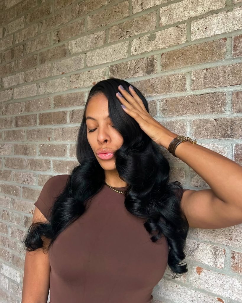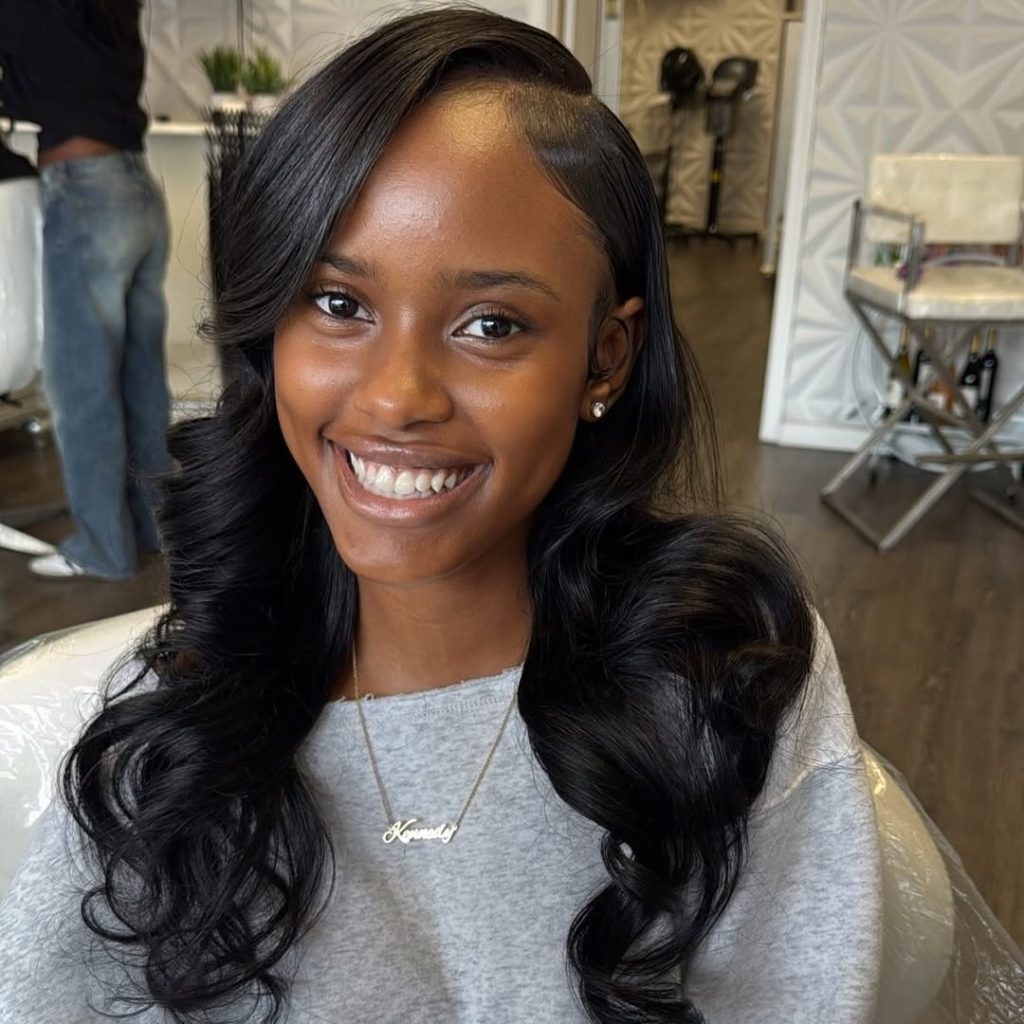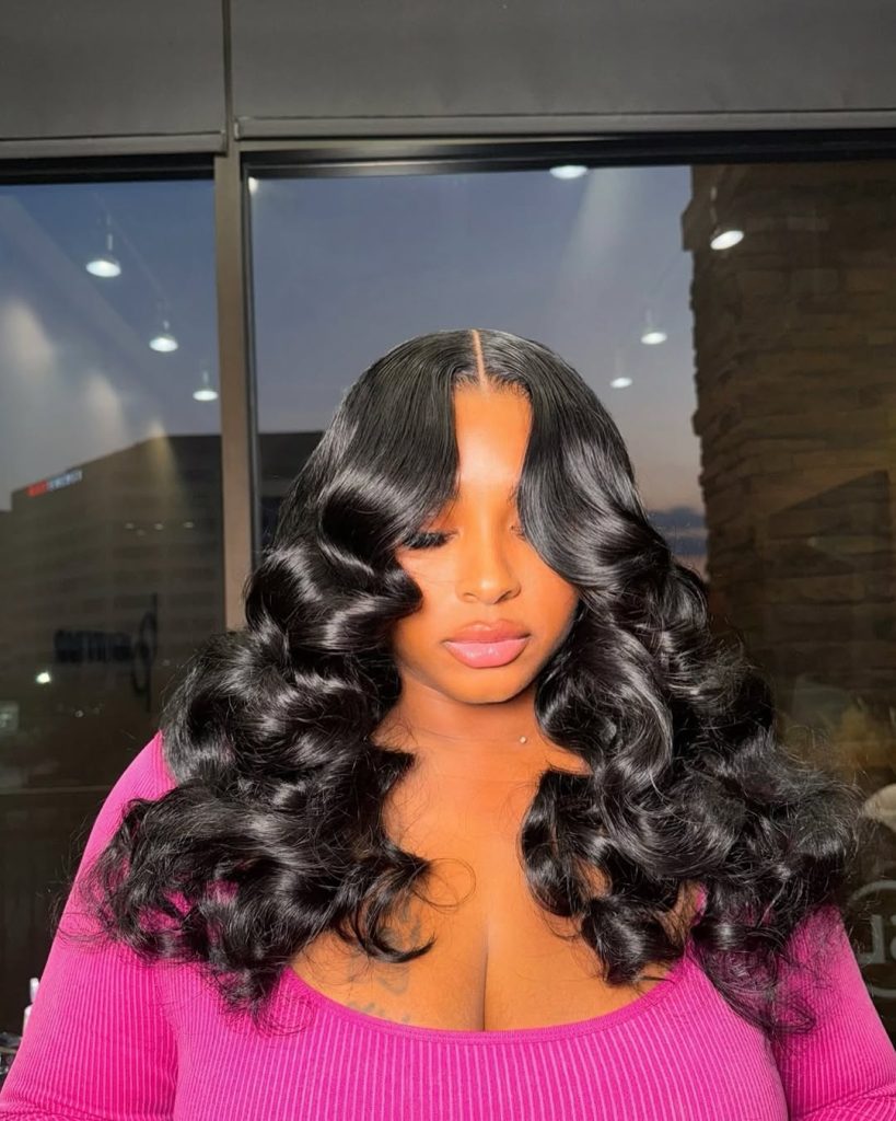 Long, cloud-soft waves tumble from a low side part with perfectly sculpted edges—a great “everyday glam” texture for women who want movement minus daily heat. If you’re protecting your leave-out, request a full-cap install (Pronto) so the hairline stays sleek through workouts and commutes. Refresh with water and leave-in and scrunch.