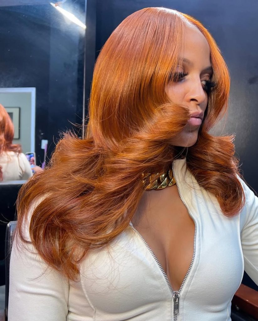 The copper tone is the star here—luminous, skin-warming, and very “editorial off-duty.” A quick weave in a bright color like this lets you try something bold without committing to permanent dye. The finish: wide bends through the mid-lengths and a glamorous flip at the ends.