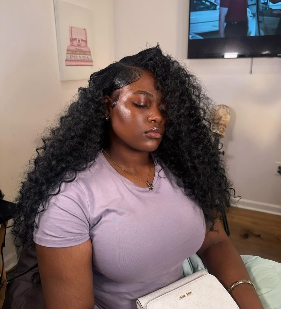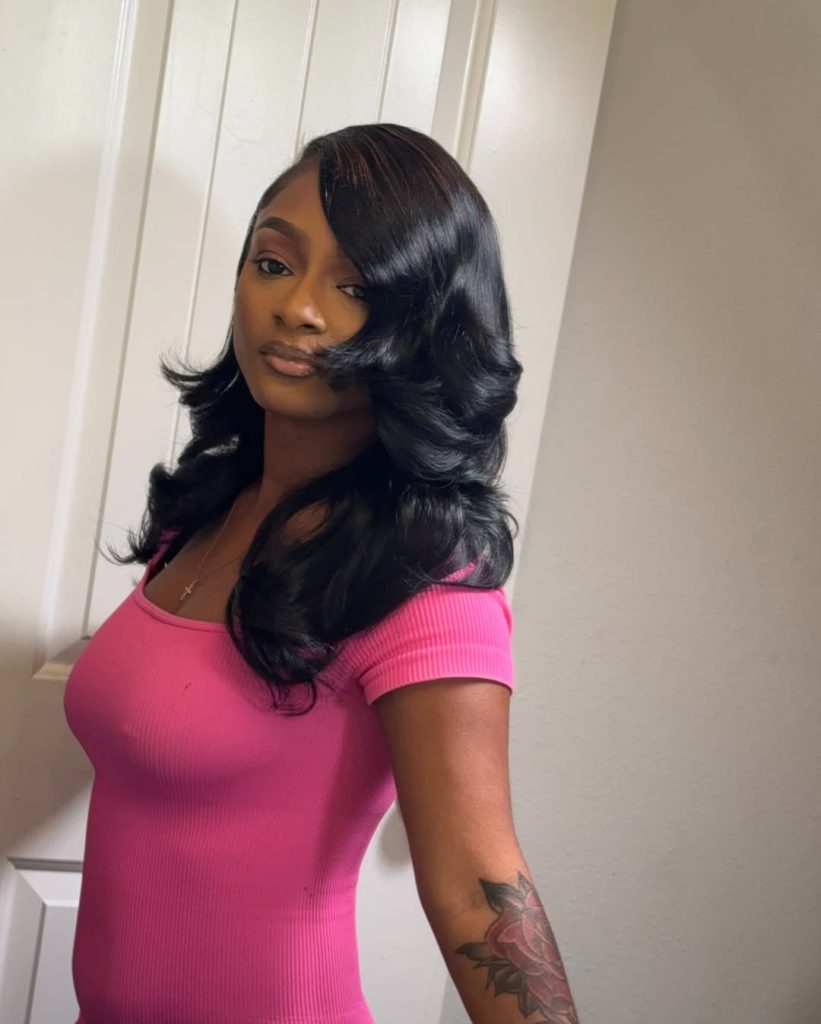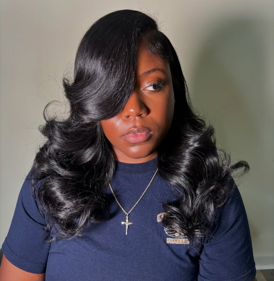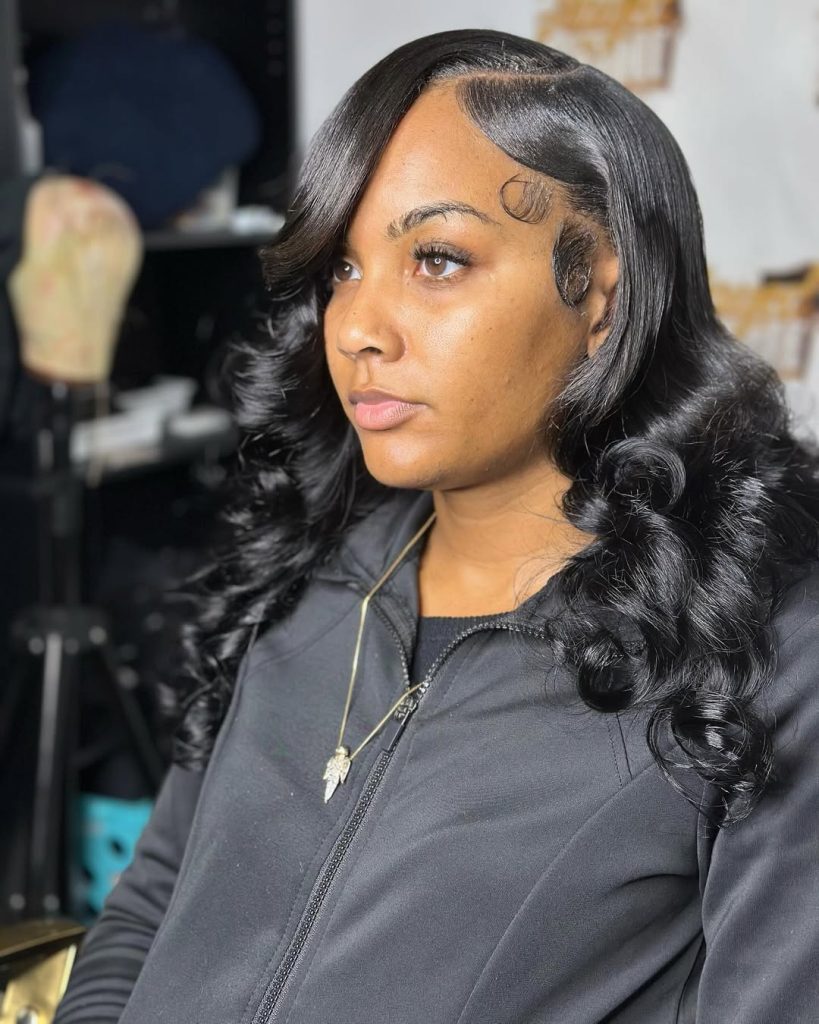 A precise side part with a single swoop over the brow and plush curls makes this glam a sure miss. It’s a casual quick weave that’s perfect for campus tours, coffee runs, or a casual Friday—“pretty without trying” is the vibe!