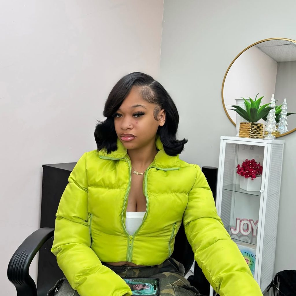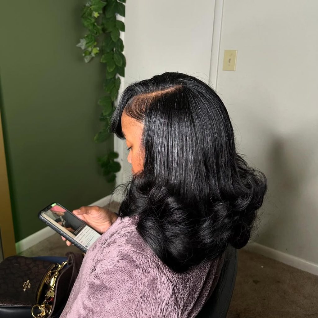 A cropped, shoulder-grazing bob with a dramatic side part and glossy, tucked-under bends. It’s the breezy, errand-to-dinner quick weave I recommend to friends who want something Short, chic, and low-maintenance. Ask your stylist to stack tracks tighter at the perimeter for extra flip and to lightly feather the crown so the shape stays bouncy, not boxy. A lime puffer and camo joggers turn this into a perfect back-to-school or weekend fit.
