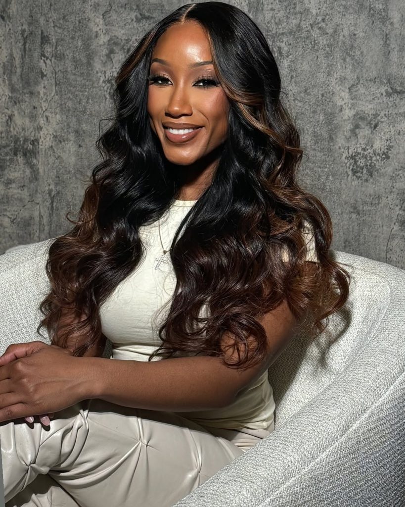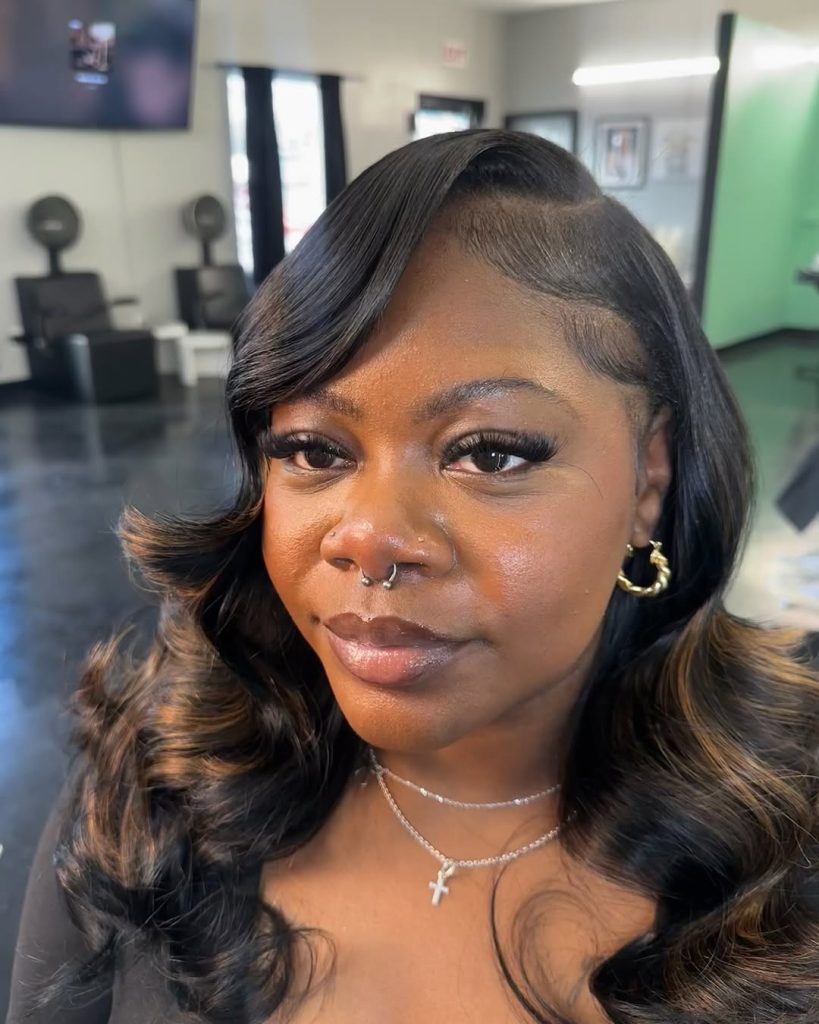 And if you’re color curious, this is the time. Bold caramel ribbons sweep across a dramatic side part and melt into bouncy layers. The quick weave makes high-impact color low-commitment; you can test warmth and placement before opting for a permanent service. The roots are kept deep to frame the eyes and uplift the complexion.
