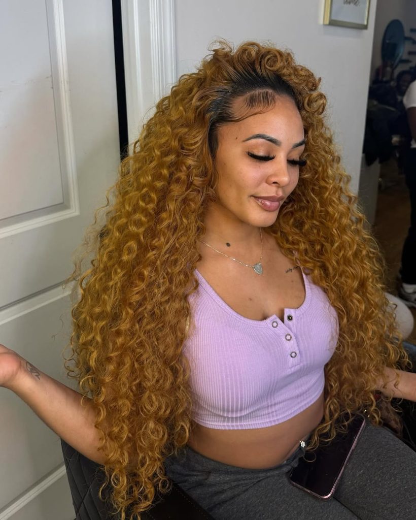 A sunshine-honey cascade with springy, uniform spirals—picture-perfect festival or vacation hair. Quick weave lets you try bold color and dramatic long length without committing to bleach on your natural curls. A soft side sweep keeps the hairline natural and the baby hairs polished.