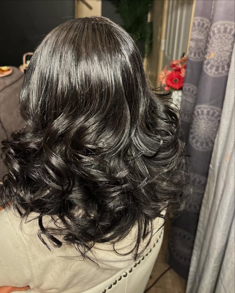 Classic, coiled ends with a sleek top and a gentle offset part—proof that “everyday glam” is alive and well. The curls are tighter at the bottom for longevity, a great choice for busy weeks.