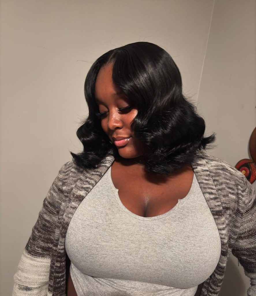 A shoulder-grazing, softly beveled bob with sculpted S-waves and a neat mini part through the center. This is that timeless “quiet luxury” shape—polished enough for the office, flirty enough for date night. I wore a similar quick weave last fall, and the secret to keeping it airy (not helmet-y) was staggered layering through the bottom two tracks.
